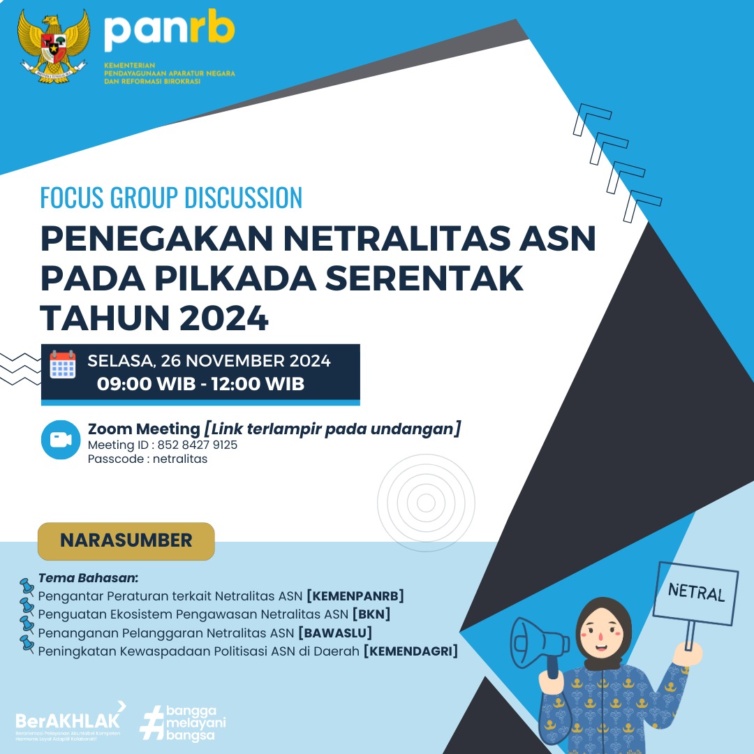 Dalam rangka menyongsong Pilkada Serentak Tahun 2024, Kementerian PANRB melalui Staf Ahli Bidang Politik dan Hukum akan mengadakan FGD bertema “Penegakan Netralitas ASN pada Pilkada Serentak Tahun 2024”. Kegiatan ini dilaksanakan untuk berbagi pengetahuan terkait netralitas ASN selama Pilkada berlangsung agar kawan-kawan ASN paham batasan netralitas sehingga dapat dihindari pelanggaran-pelanggaran netralitas ASN. FGD akan dilaksanakan pada :