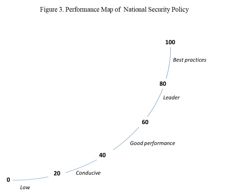 In order to measure the performance of national security of a country, it is being developed of a simple model of measurement range from zero (0) to a hundred (100) which level of performance arbitrary set as 0 – 20 is having a low performance; 20 – 40 is having a conducive performance; 40 – 60 is having a good performance; 60 – 80 is having a leader’s performance; and 80 – 90 is having best practices and considered as the world leader in national security policy (see figure 3)[ The idea is being inspired by Malcolm Baldrige for Performance of Excellence. The author is a founder of Indonesia Performance of Excellence Foundation, as a Malcolm Baldrige license holder in Indonesia. For Baldrige see www.nist.gov/baldrige. For IPE see www.indonesianqualityaward.org.].