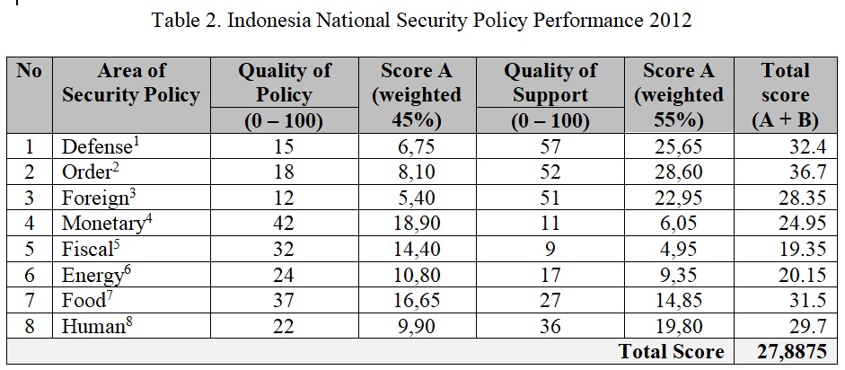 Independent research has been conducted in 2012 had founded that Indonesia score of the performance of its national security policy is 27.8875. The score is contributed, firstly, by the quality of policy: 15 of Defense Policy, 18 of Domestic (security) policy, 12 by Foreign Policy, 42 by Monetary policy, 32 by Fiscal policy, 24 by Energy Security Policy, 37 by Food Security Policy, 22 by Human Security Policy. The second contribution is regard to the quality of support toward the policy from domestic side, as an endowment factor. It is contributed by Defense Policy by 57; Domestic (security) policy by 52; Foreign Policy by 51; Monetary policy by 11; Fiscal policy by 9; Energy Security Policy by 17; Food Security Policy by 27; and Human Security Policy by 36. (see table 2. Indonesia National Security Policy Performance). In regards to the performance map, the score of 27.8875 is meaning a conducive performance[ For proxy of data, see appendix table 2.].