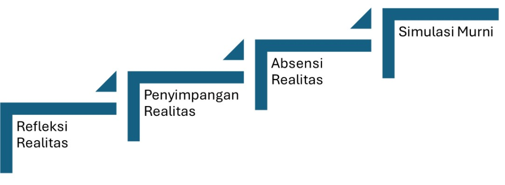 Baudrillard membagi simulakra ke dalam empat tahap, mulai dari refleksi realitas hingga simulasi murni (Baudrillard, 1994). Dalam konteks Indonesia, media sosial menunjukkan pergeseran menuju tahap simulasi murni. Filter wajah, konten berbayar terselubung, dan narasi personal yang dikurasi menampilkan tanda-tanda yang tidak lagi merujuk pada realitas, melainkan pada tanda lain yang telah dinormalisasi dalam budaya digital.