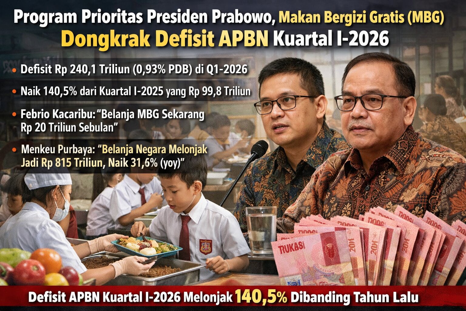 1. Program prioritas Presiden Prabowo, Makan Bergizi Gratis (MBG), menjadi salah satu pendorong utama kenaikan belanja pemerintah sehingga APBN mencatat defisit Rp 240,1 triliun (0,93% PDB) di kuartal I-2026. Defisit ini melonjak 140,5% dibanding kuartal I-2025 yang Rp 99,8 triliun (0,41% PDB). Dirjen Strategi Ekonomi dan Fiskal Kemenkeu Febrio Kacaribu mengatakan, lonjakan itu karena belanja pemerintah tereksekusi dengan baik, terutama MBG. Dibanding 2025, belanja MBG sekarang jauh lebih cepat, rata-rata Rp 20 triliun sebulan.