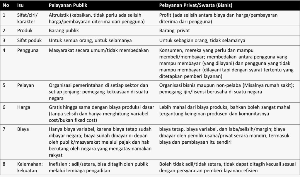 Pelayanan publik dan pelayanan privat/swasta adalah dua konsep yang berbeda dalam tata kelola pelayanan kepada masyarakat. Keduanya memiliki karakteristik yang unik, baik dari segi sifat, pengguna, hingga harga. Dalam artikel ini, kita akan membahas lebih rinci mengenai perbedaan antara kedua jenis pelayanan tersebut berdasarkan delapan aspek utama yang dijelaskan pada tabel berikut.